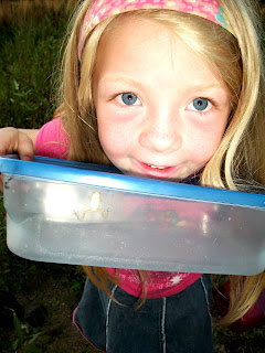 Last night we set out at dusk armed with rain boots, gladware, and the net we use to clean the pool to, well....catch frogs! Amarra loves frogs and reptiles and non-spider bugs. She missed our "frog friends" we liberated last summer, so we trekked down to the pond to see what we could see. At first it looked like the journey would be a wash, but then I found one...half the size of the tip of my pinky finger at best. When we realized how small the frogs were that we were looking for, we started to find them. After an hour or so of lurking and hunting we brought home Yoyo, Rainbow, Quizzler, Lucy, Johnny, Olie, Zoe, and Frisbee. The next hour was spent watching them hut tiny crickets in their new tank! (I must say, the juxtaposition of the life-size cardboard Sleeping Beauty and the frog tank.....SO describes my girls. What can I say?)